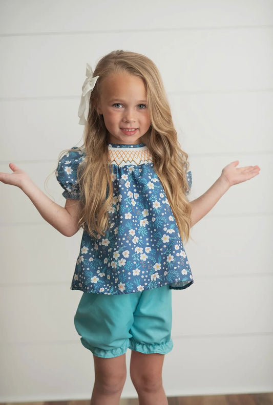 Navy Teal Smocked Spring Bloomer Set
