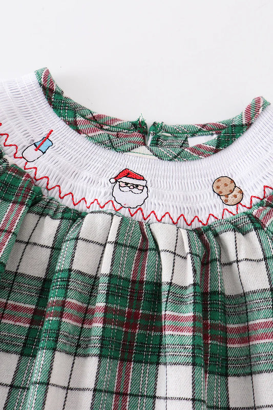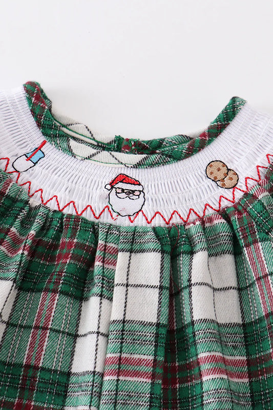 Green Plaid Santa Claus Smocked Baby Girl Romper